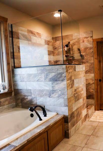 master bath features copper sinks, custom pallet board mirrors and plenty of storage space. The sunken tub and massive tile shower are strategically located to allow plenty of room for dressing.