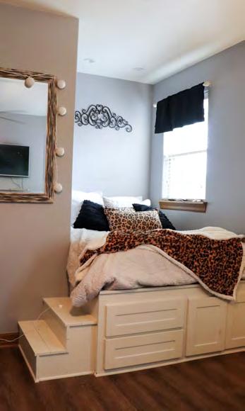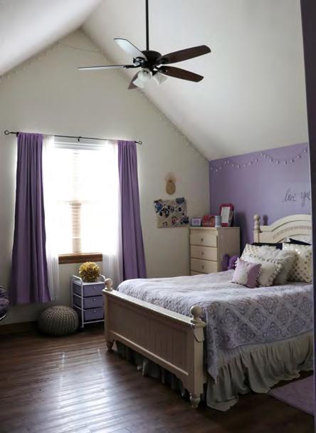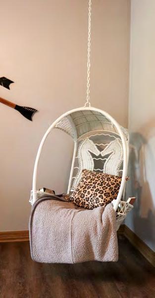 A rebar and wood bannister adds the perfect mix of industrial and rustic elements to the staircase. Upstairs, the teens’ bedrooms reflect each of their individual personalities. Laid back with minimal decoration, Coltin’s room is a typical boy’s room. With a neutral color palette, pops of color keep his room inviting and add a cool vibe. Clean and fresh, Cayli’s room features a wall-mounted flat screen TV, a swing that hangs from the ceiling, and a built-in custom bed accented with neutral colors and leopard print accessories. Carlyn’s pretty purple room is both stylish and functional and features a cozy papasan chair and garland lights around the ceiling.