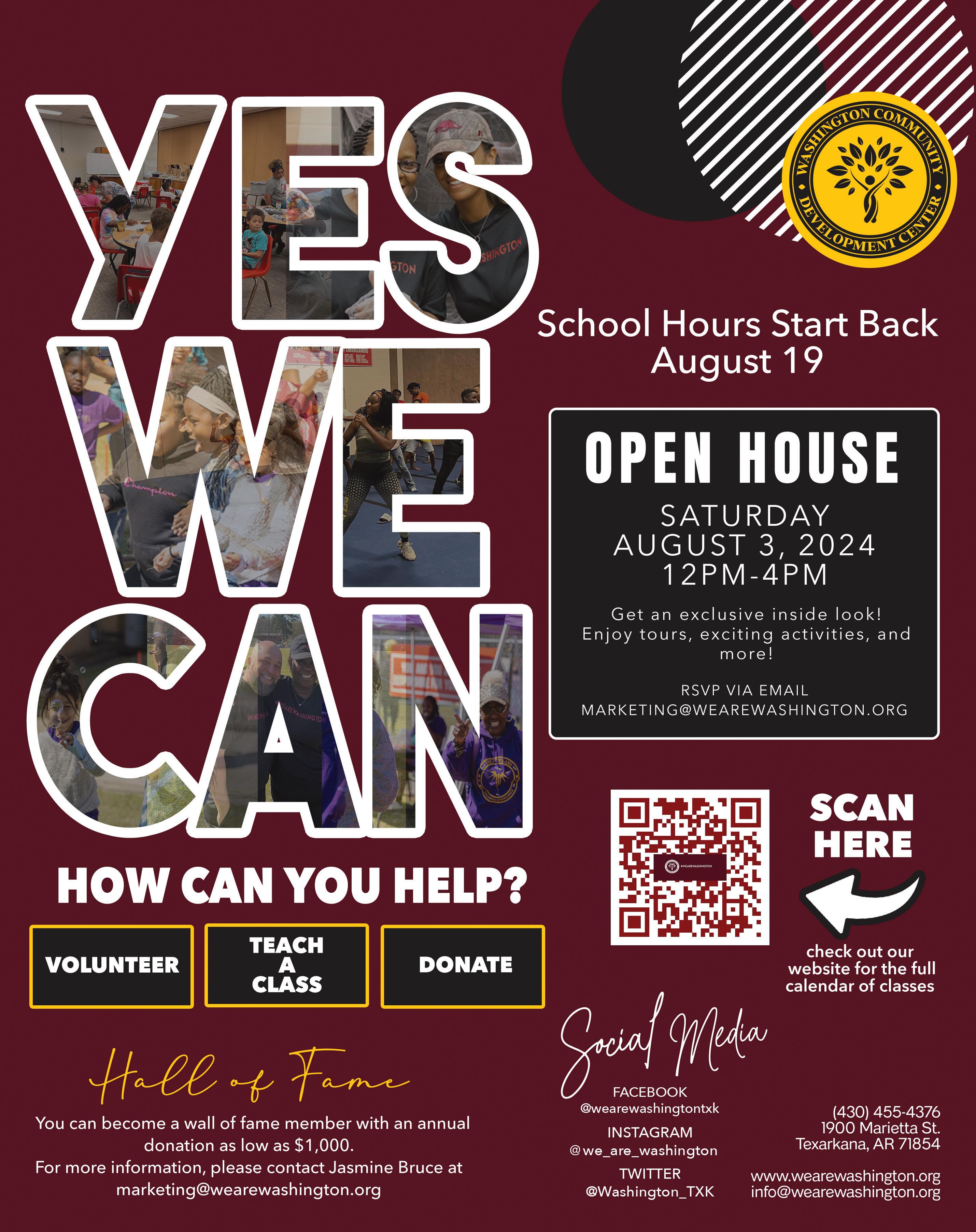 Get an inside look at all the activities and classes We Are Washington offers to our community, and discover how you can get involved. We Are Washington is located at 1900 Marietta Street in Texarkana, Arkansas. The open house will run from 12 p.m. to 4 p.m.