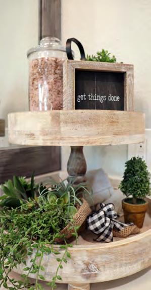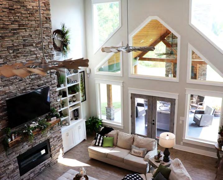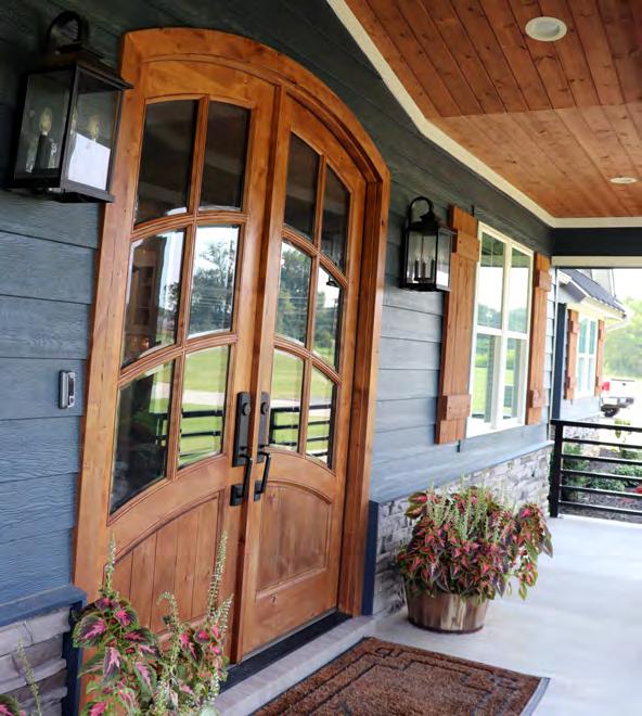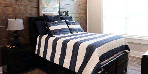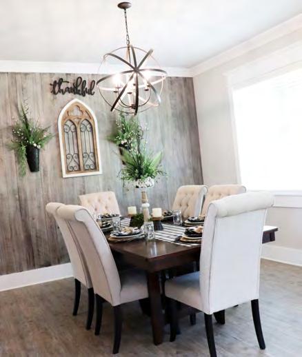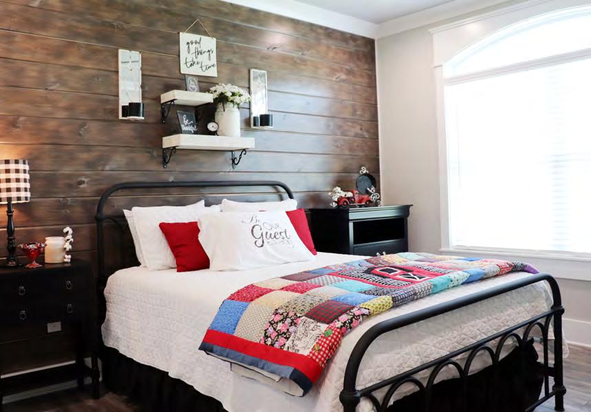 A mix of older and newer furniture adds warmth and flair throughout the sleek home. Farmhouse-inspired accents and unique light fixtures from Logan Electric blend seamlessly in the common areas. Vinyl plank floors provide durability and sustainability, accenting the earthtone color palette used throughout the home. Wooden accent walls and ceilings by William Tate are eye-catching and strategically placed in many areas of the home. Shane’s aunt, Regina Burns, who passed away in 2020, decorated the home as part of her therapy while she was going through cancer treatments. Her knack for design gives the Kelleys much solace as they look around their home and see her personal touches everywhere.