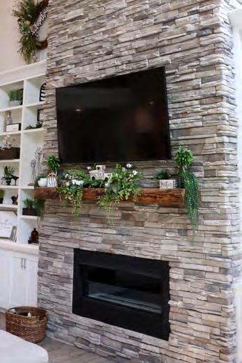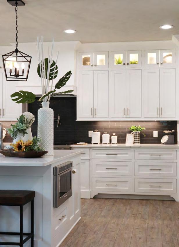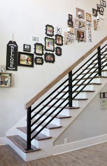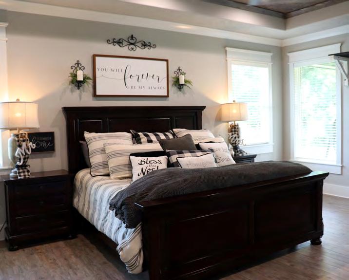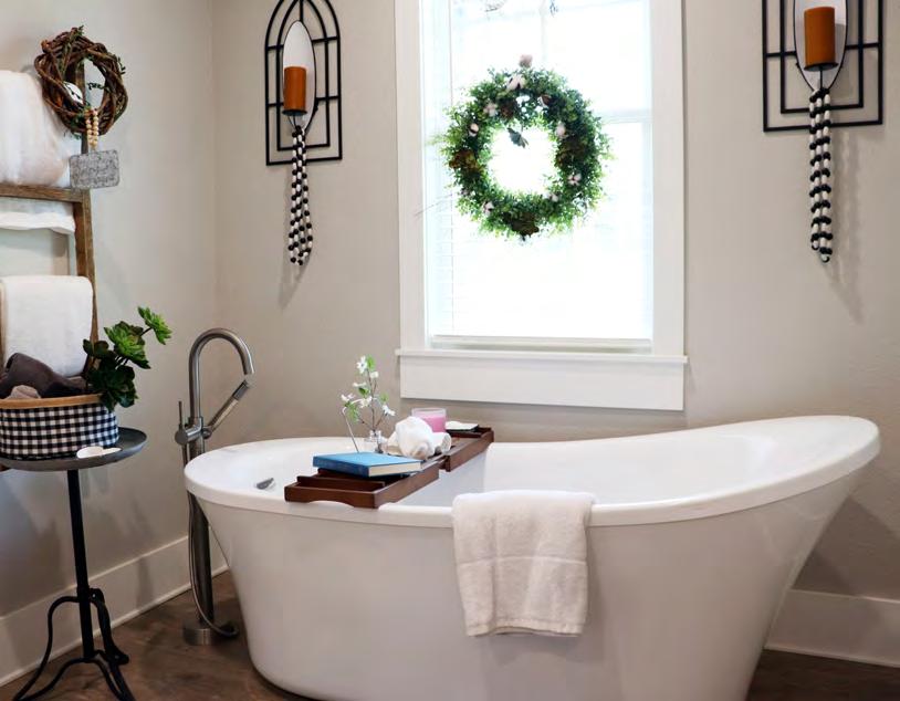 The contemporary master suite exudes comfort and relaxation. A sign above the bed reads, “You will forever be my always.” Black, gray, and white bedding lends a touch of sophistication while light streams inside through the windows. Barn doors lead into the spacious spainspired bathroom. His and hers vanities provide adequate room for both Kelly and Shane to prepare for their work day. A soaking tub offers the perfect relaxing bath while a built-in bench and rain shower head complete the walk-in shower retreat. Behind the barn doors, clothes are