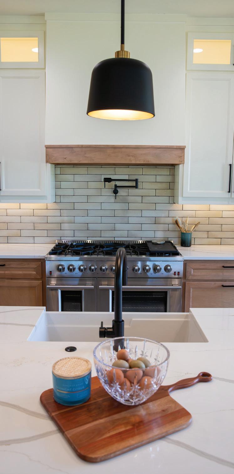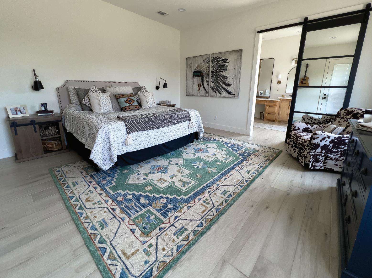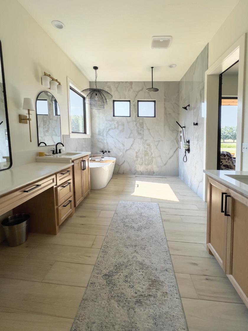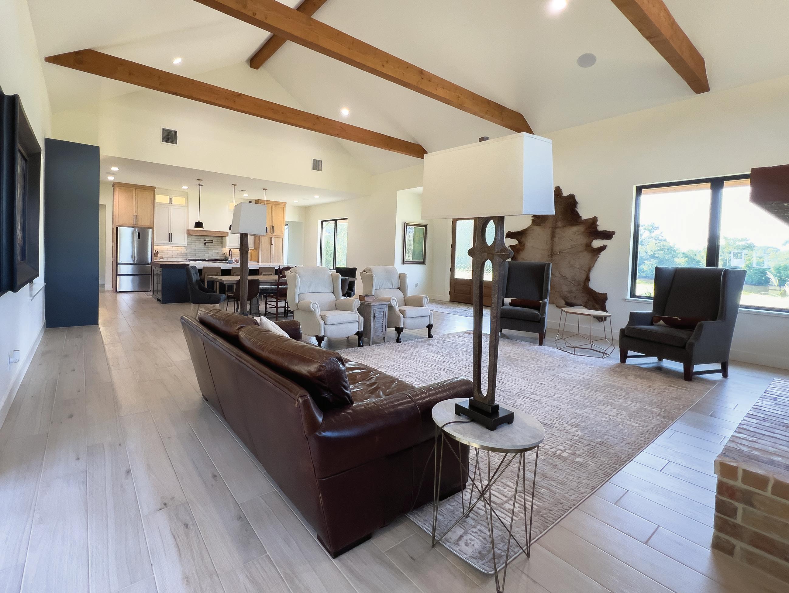 The inspiration for their home’s design came from a wedding the couple attended in Louisiana, where they were struck by the breathtaking venue. Determined to recreate that stunning space, they set out to design their own sanctuary. The main living area and kitchen certainly evoke awe, with massive windows and wooden beams framing the cathedral ceiling of the living room. The elegant kitchen features matte black pendant lights over a white marble counter, as well as a posh bar area with built-in shelving and pantry space. Tucked away behind the kitchen is a cleverly designed space which serves as a mudroom from the garage entrance and a small office nook.