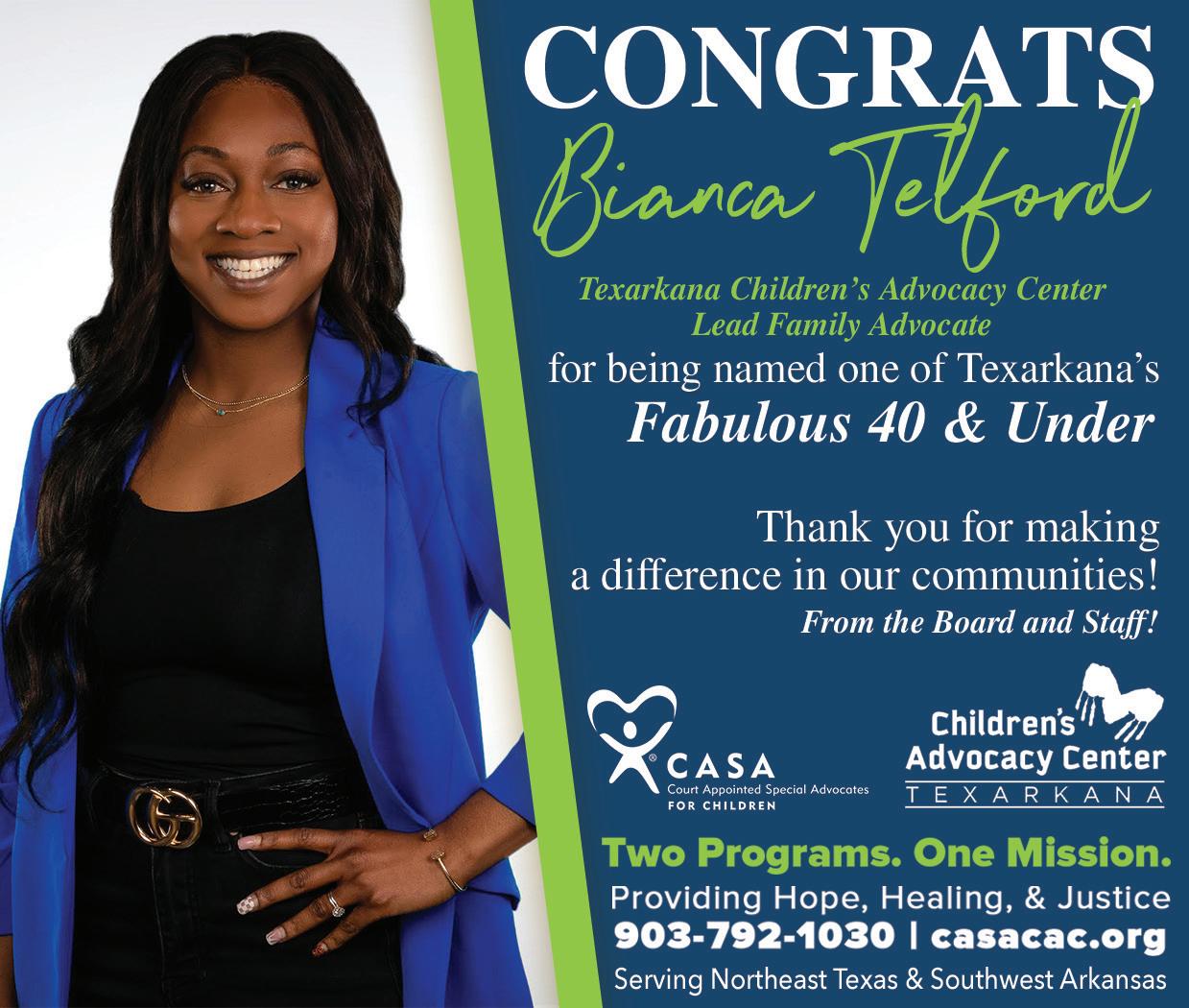 In addition to her work in child advocacy, Bianca is a member of the Junior League of Texarkana. She is married to Chance Telford, and the couple is currently expecting twins.