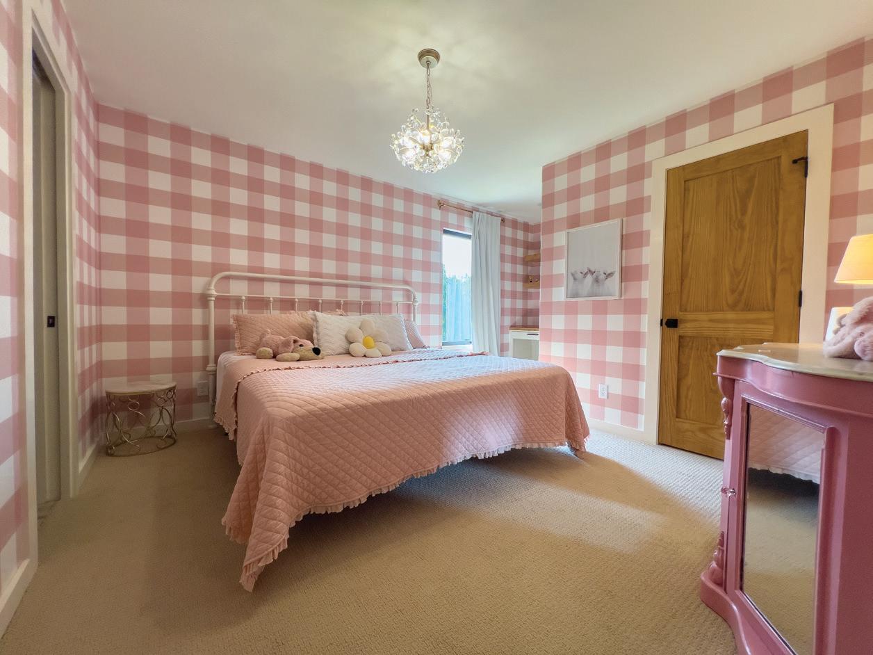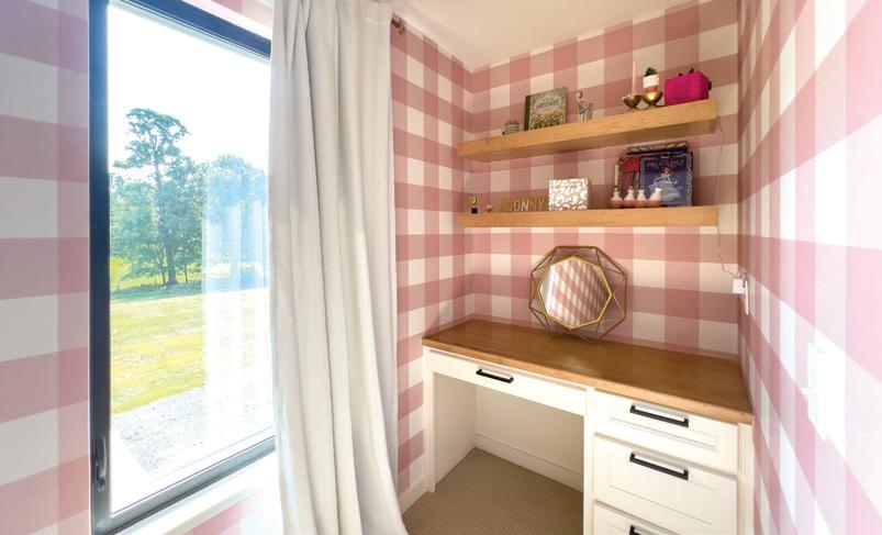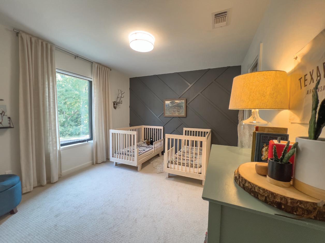 Upstairs is the domain of John and Jessica’s 3-year-old twins, Boies and Sonny. A Jack and Jill bathroom connects their lovingly designed bedrooms. Boies’ room, fit for a young cowboy, boasts rustic wooden cribs, faux cacti, cowboy hats, and a large window overlooking his “terrain.” In contrast, Sonny’s room has pink checkered walls, a crystal chandelier, and an array of beloved stuffed animals, including a plush dog that Jessica loved in her own childhood. Outside of the two bedrooms is a play space.