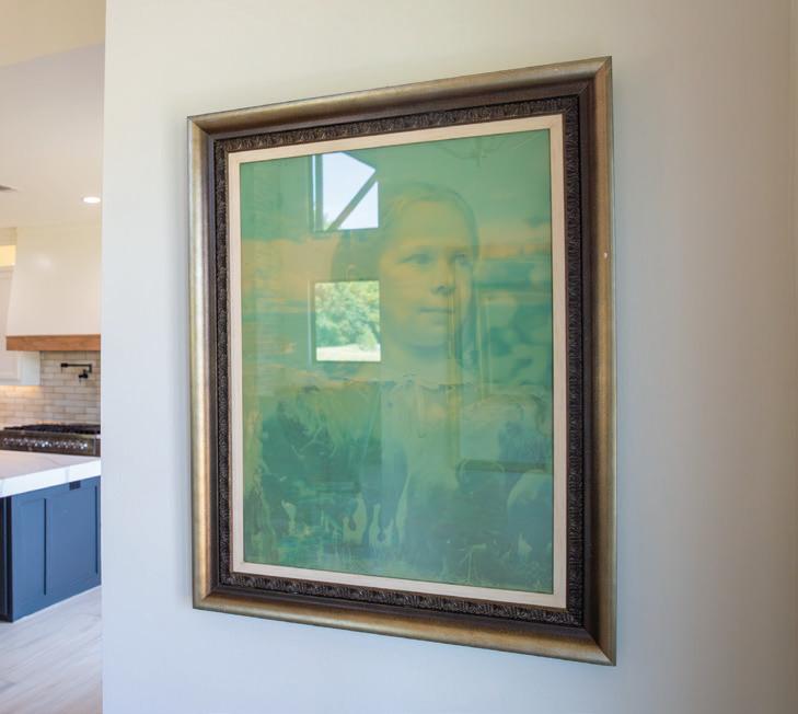 In the living space, two particularly striking artworks command attention. By the front door hangs a piece by Jessica’s cousin, Meg Breaud, depicting a young girl with multiple superimposed images. Across the room, a large oil painting that once adorned Jessica’s childhood home now graces the space.