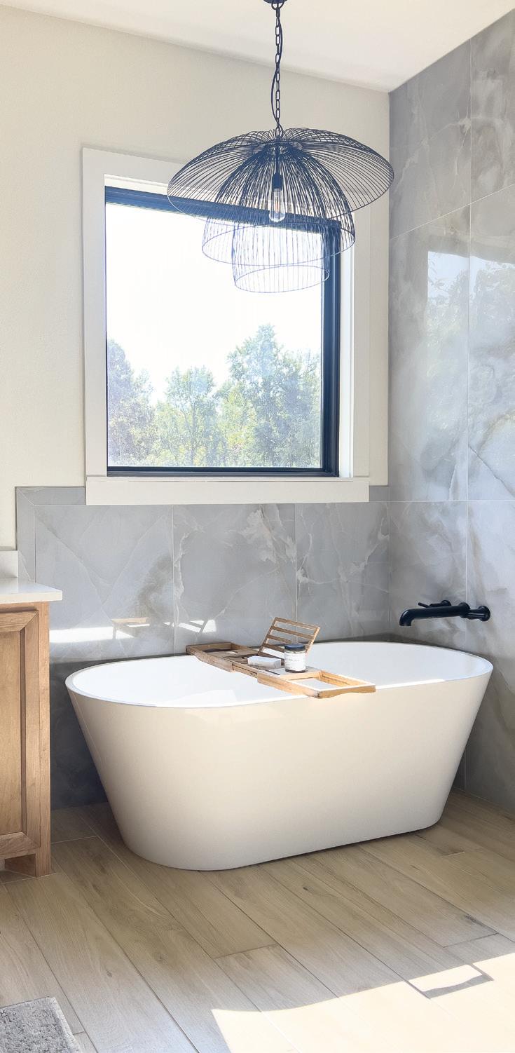 Beyond the living room and kitchen lies the primary bedroom suite. A two-piece commissioned artwork by local artist Joseph Raymond hangs on the wall facing the entrance. The sliding metal door leading into the master bath was made by Jessica’s father himself. The bathroom features a stunning wetroom with gray marble walls and a sleek, modern bathtub, all illuminated by a chic black lighting fixture.