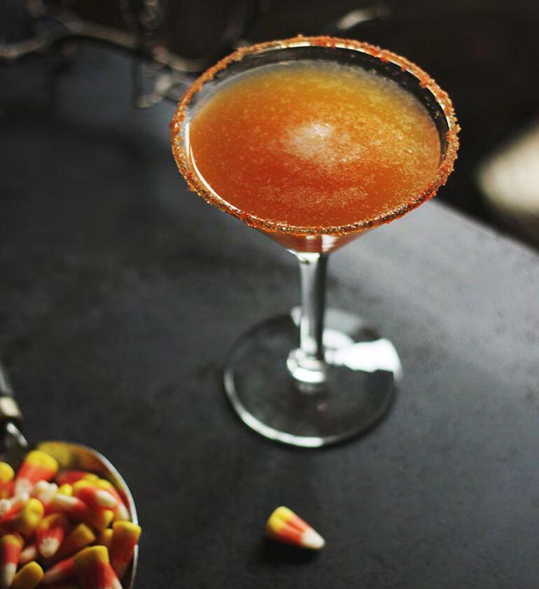 Use honey around the rim of the glass, and dip into orange sugar sprinkles. Combine candy corn syrup and pineapple juice and 2 ozs. of vodka in a shaker with ice and shake until cooled. Strain mixture into glass. Add the club soda to finish it off.