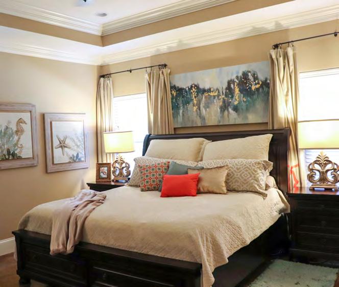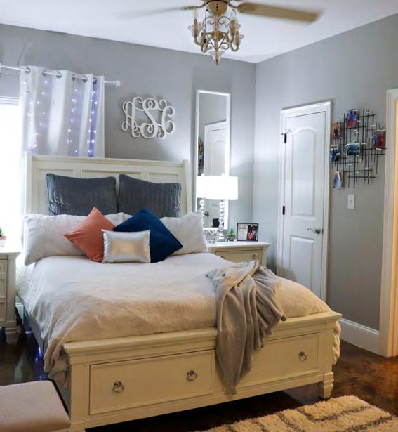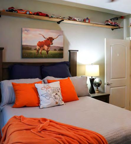 At the front of the home sits 10-year-old Zack’s Texas-themed room, decked out in an orange and navy color scheme. His favorite personal treasures are seen all around his room ... ranging from books, “Toy Story” figures, Legos, toy tractors, and a farm set. His bedroom suite from Glen’s Furniture features a Texas throw pillow and adequate storage drawers beneath it.