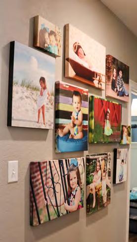 The hallway between the bedrooms features photographs and collages of Anna Claire and Zack as children. Both of them have a framed collage of baby items, including outfits, rattles, bibs, booties, and sonogram photos.