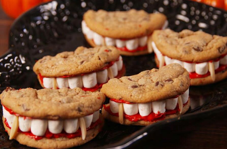 3. Place mini marshmallows around the round edges of half of the halves. Place the remaining halves on top, then stick a slivered almond on each side to create fangs.