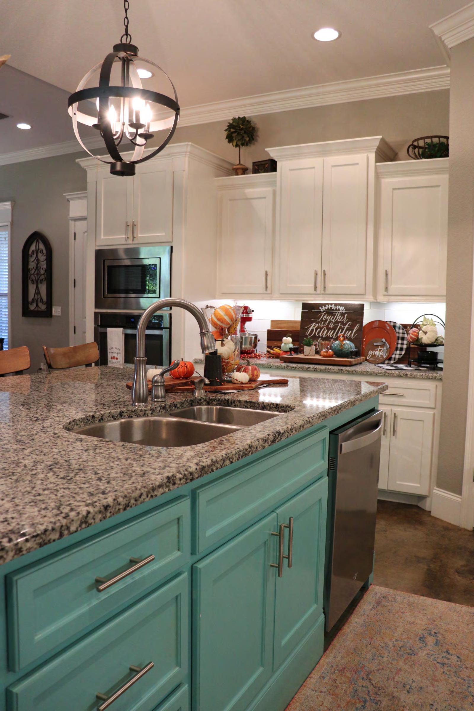 Since Dana spends quite a bit of time in the kitchen cooking meals, baking pies, and preparing charcuterie boards, her spacious kitchen is a chef’s dream. The massive turquoise island offers a useful food prep space, as well as a place for friends and family to congregate during a meal. Spherical pendant lights from Logan Electric illuminate the area, while granite countertops and stainless appliances add functionality.