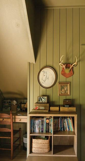 The Osburns had previously constructed a cabin, which greatly influenced their vision for their new residence. Drawing from this inspiration, Suzy took charge of the home’s interior design, crafting a space she characterizes as “modern-rustic meets cottagecabin.” Aiming to capture this comfortable and organic feeling, the home’s color scheme radiates warmth and earthiness. Each space is equipped with dimmable lighting, reflecting Suzy’s preference for the gentle glow of natural light and lamps rather than the starkness of standard overhead fixtures. Every room features a decorative element that evokes the charm of a cozy cottage or a rustic cabin, be it an antique vase, a serene landscape painting, or a charming woven basket.