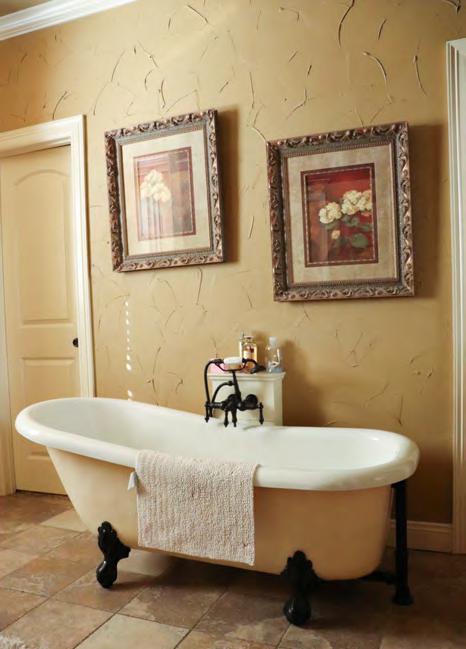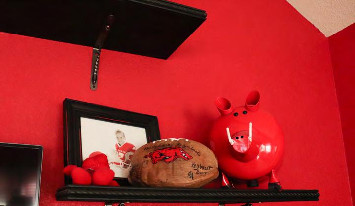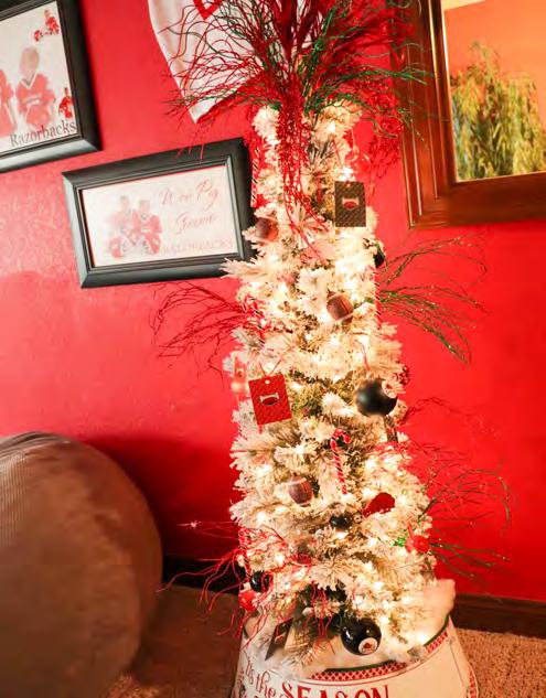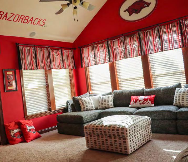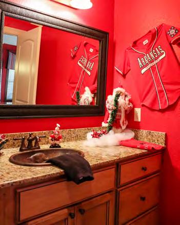 The Arkansas Razorback-themed game room showcases the team’s red, white, and black colors, perfectly coordinating with the colors of the season. A Razorback Christmas tree is decked out with playing cards as ornaments and a fun bucket stand which states, “‘Tis the Season to be Jolly!” Cozy sofas in shades of black and gray from Four States Furniture play host to stylish and seasonal throw pillows. The attached bath boasts a copper lavatory with embossed Razorbacks from Moore Supply. Hand towels embroidered with “Merry Christmas” welcome the holiday season.