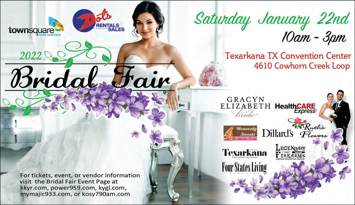 The 2022 Bridal Fair will be held from 10 a.m. to 3 p.m. at the Texarkana Texas Convention Center. For tickets or information, visit the Bridal Fair Event Page at: www.kkyr. com, www.power959.com, www.kygl. com, www.mymajic933.com, or www. kosy790am.com.