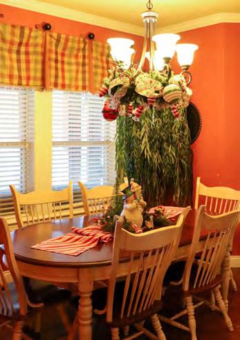 In the dining room, a red and white table runner with swags of greenery add to the holiday vibe. Mr. and Mrs. Snowman figurines brighten the room while the red and green plaid valances coordinate with the seasonal decorations. Natural greenery and colorful ornaments adorn the chandelier which is centered above the table.