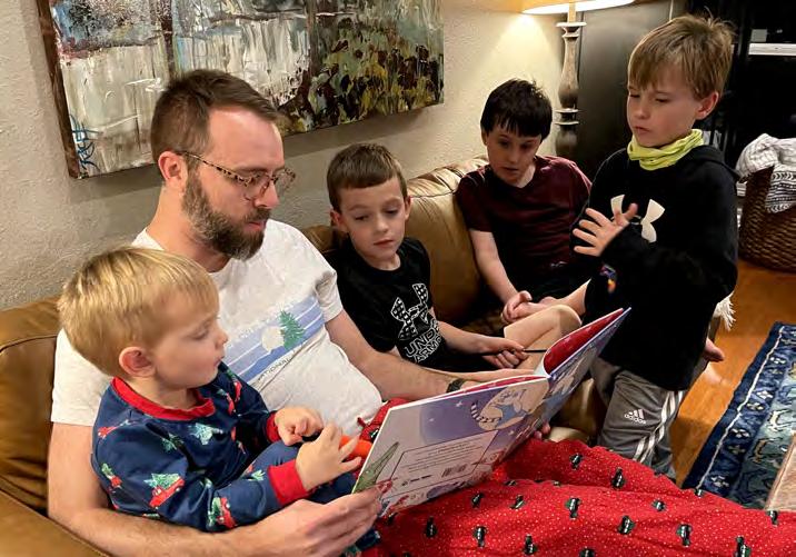 Lee reads a book to the boys, Caleb, Collin, Thomas and Coleman.