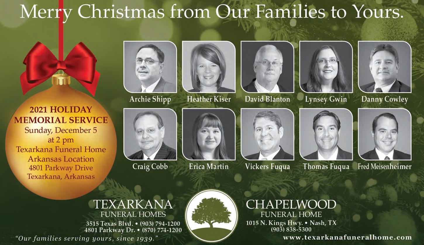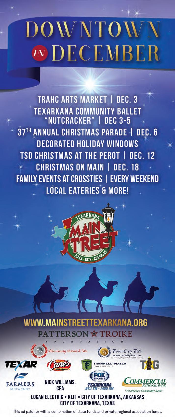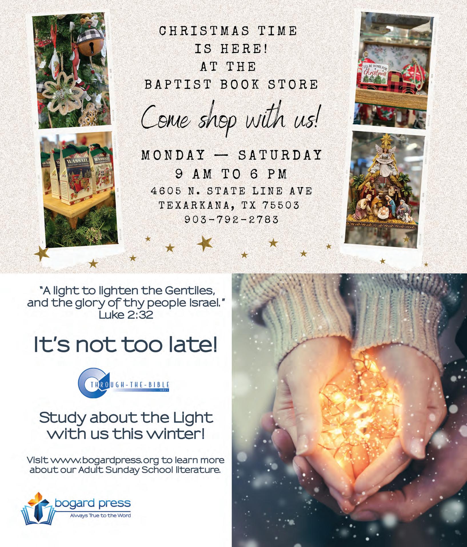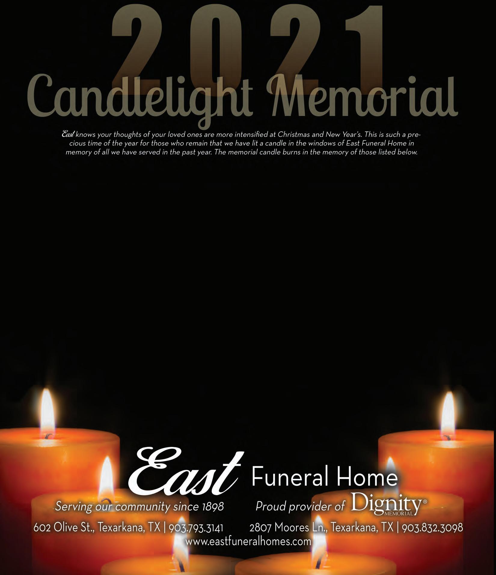 A Christmas Eve Candlelight Communion will be held beginning at 5 p.m. at First Baptist Church Texarkana. Call 903-831-6000 for additional details.