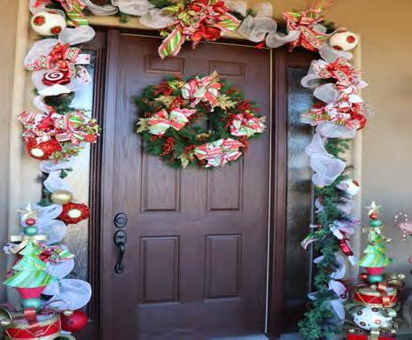 Candy cane-striped lollipops line the walkway leading up to the front door, all decked out with a complementary wreath and red and white garland. Clear lights accentuate the roof line of the home. Baskets of greenery with large red and gold ornaments are strategically placed on each side of the porch stairs. A life-sized Santa Claus sits in a porch chair, welcoming guests to this holiday splendor.