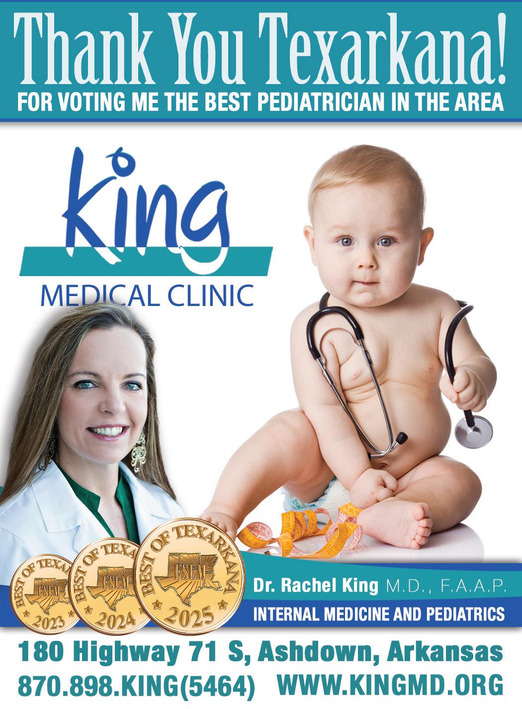 Dr. Rachel King, of King Medical Clinic in Ashdown, Arkansas, is board certified in Internal Medicine as well as Pediatrics. A 2005 graduate of the University of Arkansas Medical Sciences, Dr. King spent several years at Arkansas Children’s Hospital. Dr. King is a fellow of the American Academy of Pediatrics and a member of the American College of Physicians. With both adult and pediatric training, Dr. King enjoys being able to take care of the whole family in the community where she grew up. Parents drive from all over the four states area for Dr. Rachel King to see their children.