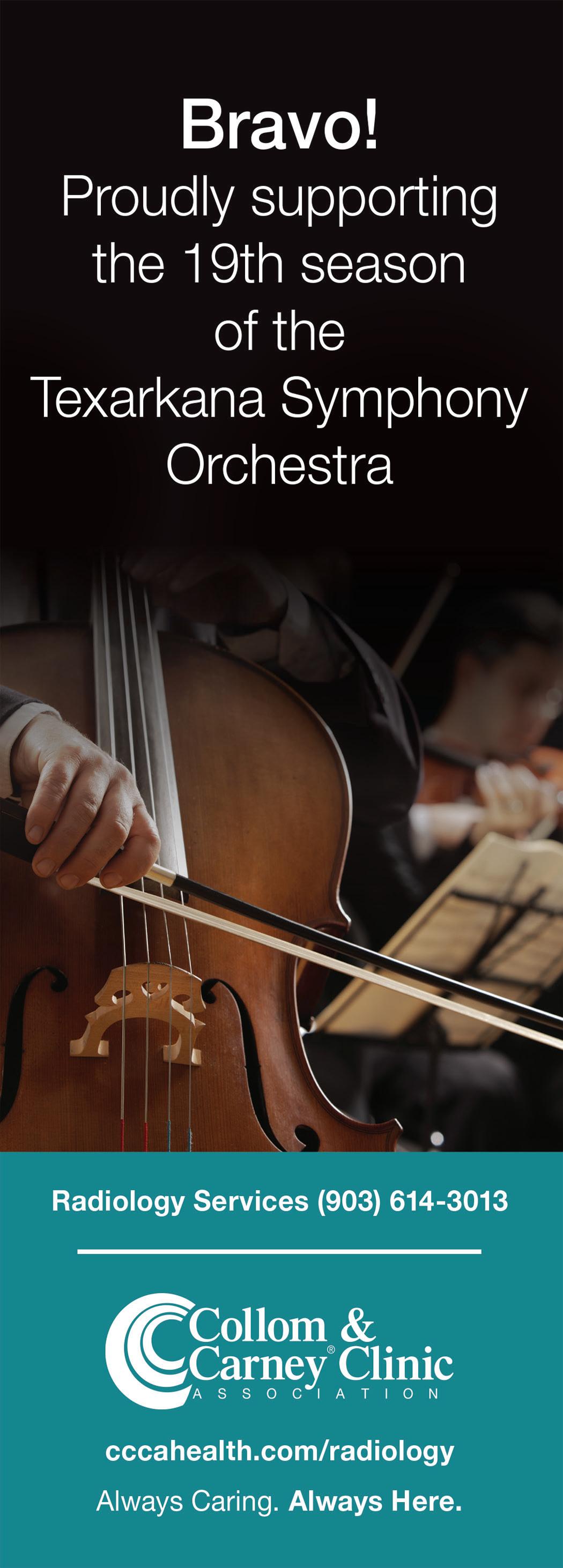 Welcome to the Texarkana Symphony Orchestra’s 19th Season! This beautiful program book is made possible by our ongoing partnership with Four States Living Magazine. This year I am happy to introduce Elizabeth Schwartz, a freelance writer and music historian from Portland, Oregon, as our new program note writer for the season. Whether by supporting TSO’s many sponsors or preparing for each concert by reading the biographies and program notes ahead of time, there is something for everyone to enjoy.