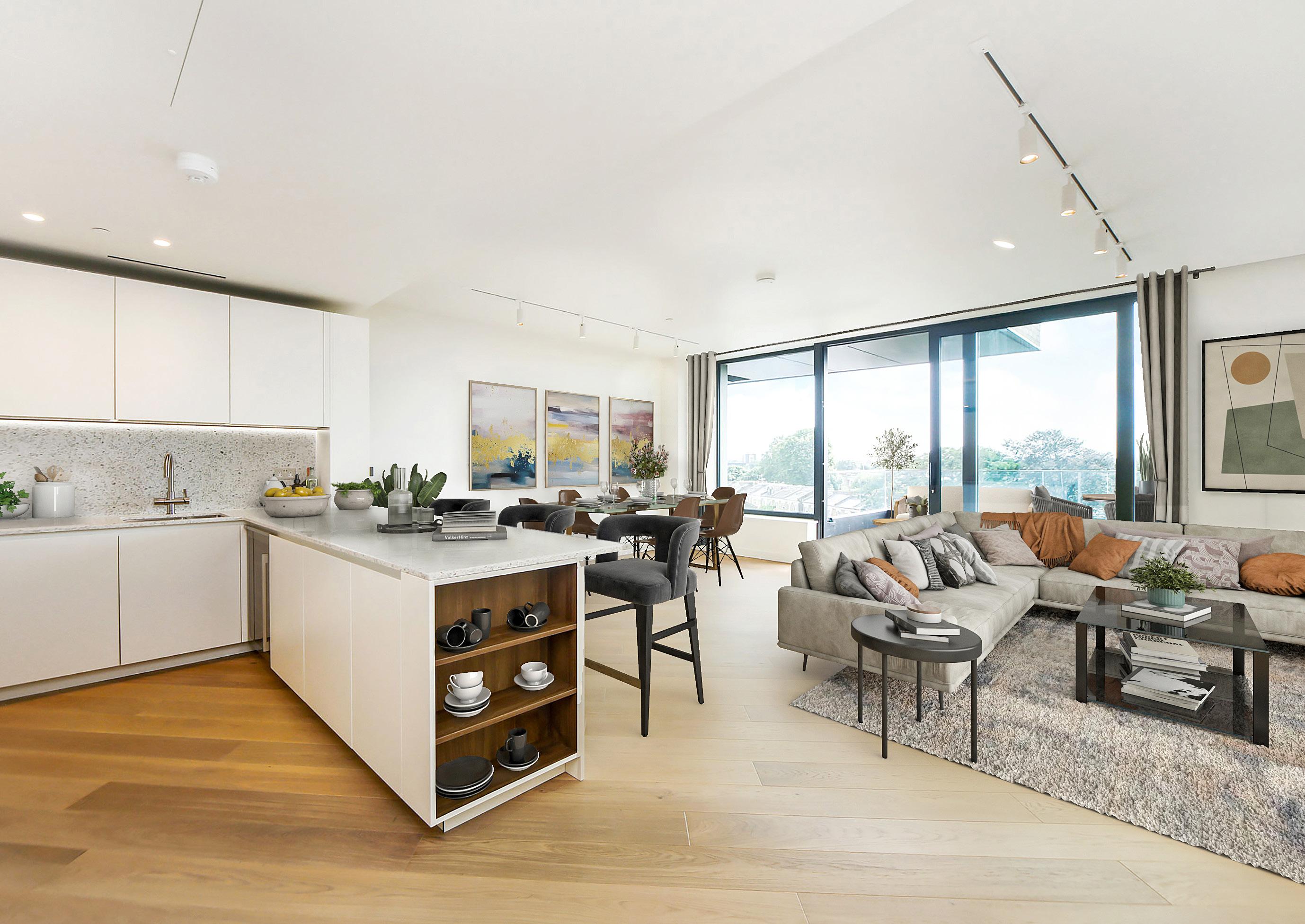 • The living area leads to a spacious decked balcony which looks over the gardens of Hammersmith Park.