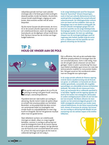 In de vorige periode oefende de Vlaamse regering rond de interne staathervorming met de formule van groen- en witboeken: ze lanceerde een discussietekst (groenboek), verzamelde alle mogelijke opmerkingen om uiteindelijk te komen tot besluiten (witboek). Wij vinden dit een interessant instrument, op voorwaarde dat er voldoende openheid is in het debat. Tegelijk zond de regering signalen uit alsof ze het werken met strategische adviesraden en andere overlegstructuren eerder als een last dan een lust ervaarde. Wij blijven alleszins de meerwaarde van het sectoroverstijgende gesprek in de SARC (strategische adviesraad voor (onder meer) cultuur) beklemtonen. En één kleine waarschuwing toch, meneer of mevrouw de minister: het insnoeren van overleg en advisering leidt dikwijls tot een voorsprong voor de sterkste roepers of de strafste lobbyisten.