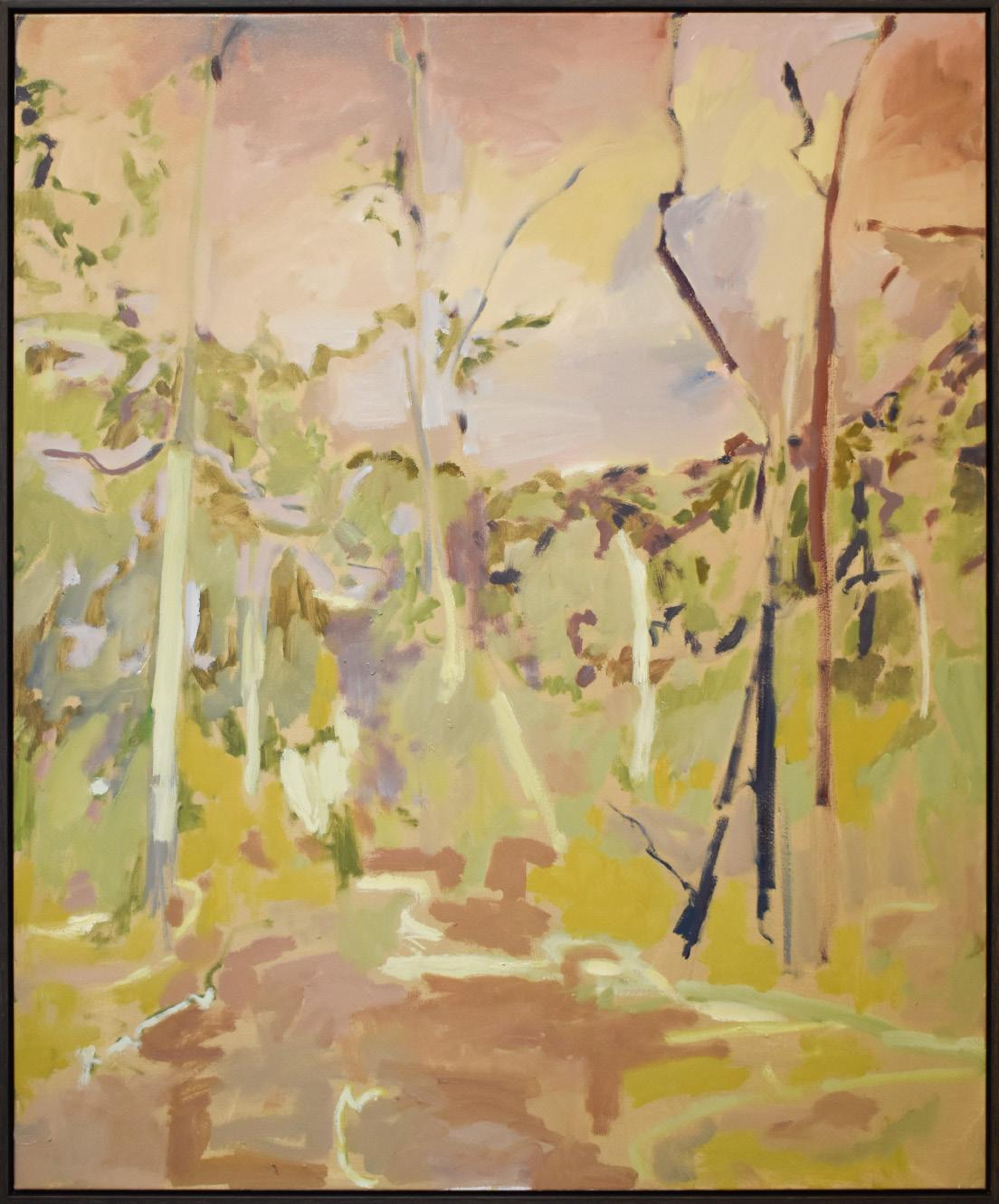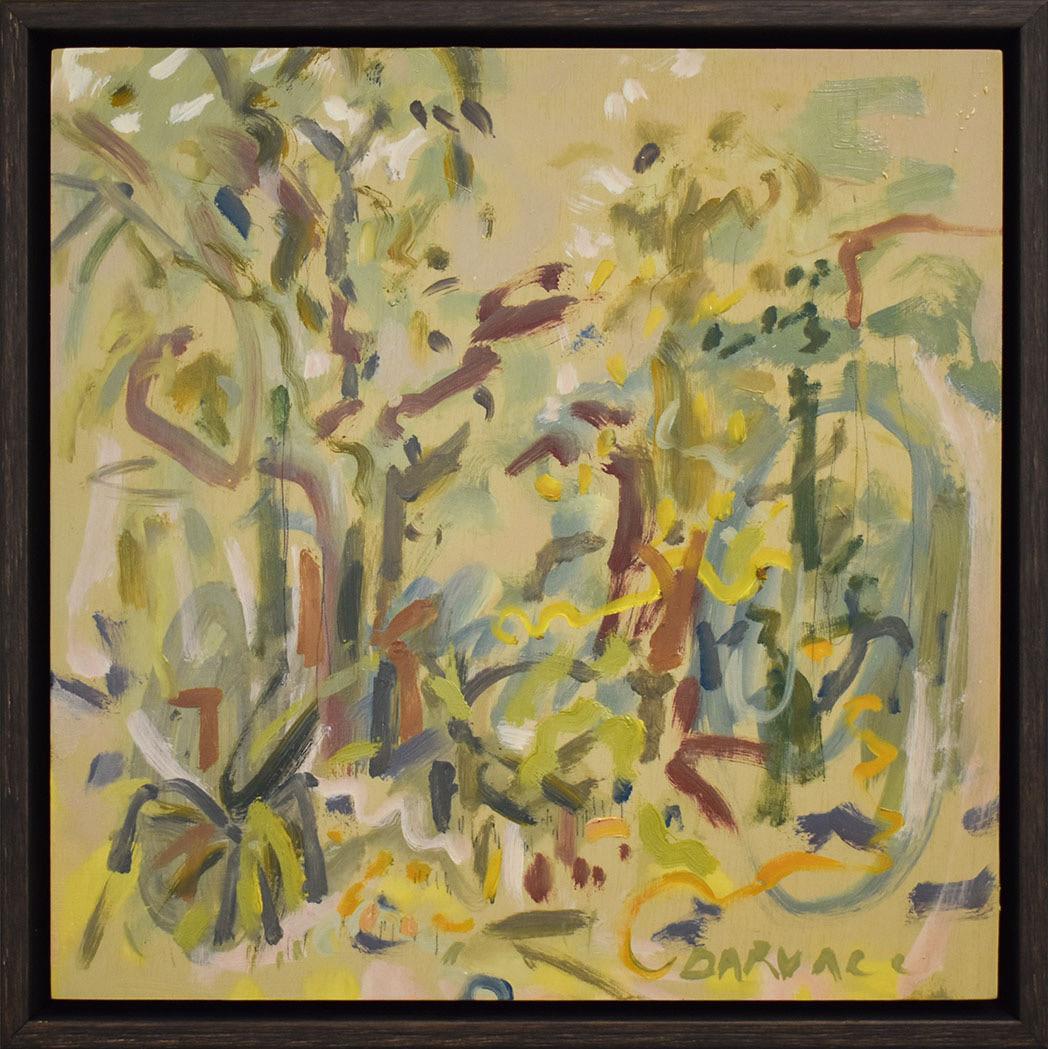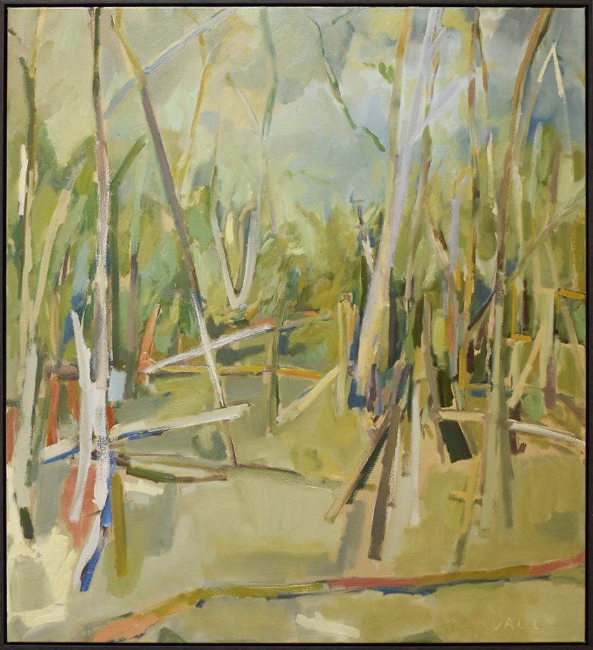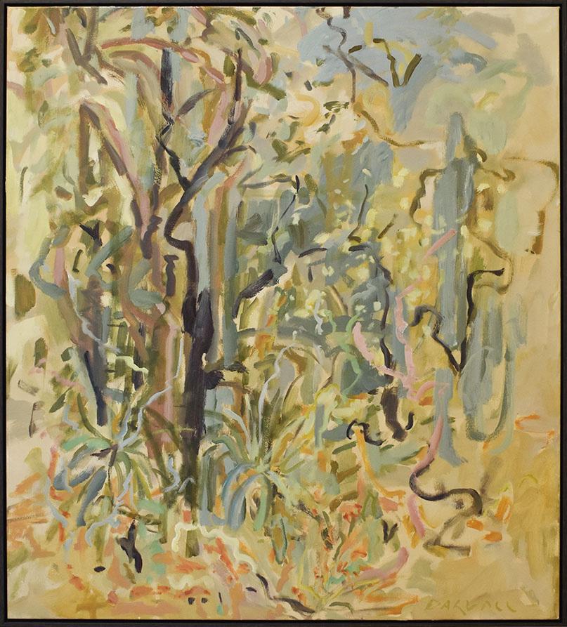 Darvall’s work articulates her sensory encounters with bushland and the ocean, arising from her frequent walks in nearby forests and coastal areas, during which she draws, paints, and listens. Her work enlivens natural spaces, expressing the free interplay between abstraction and figuration. Currently her artistic gaze combats human interference, industrial agriculture, and urbanization. The work ‘Braided Paths’ represents long worn paths which blend into a landscape studded by unruly weeds gnawed to the roots by hungry cockatoos.