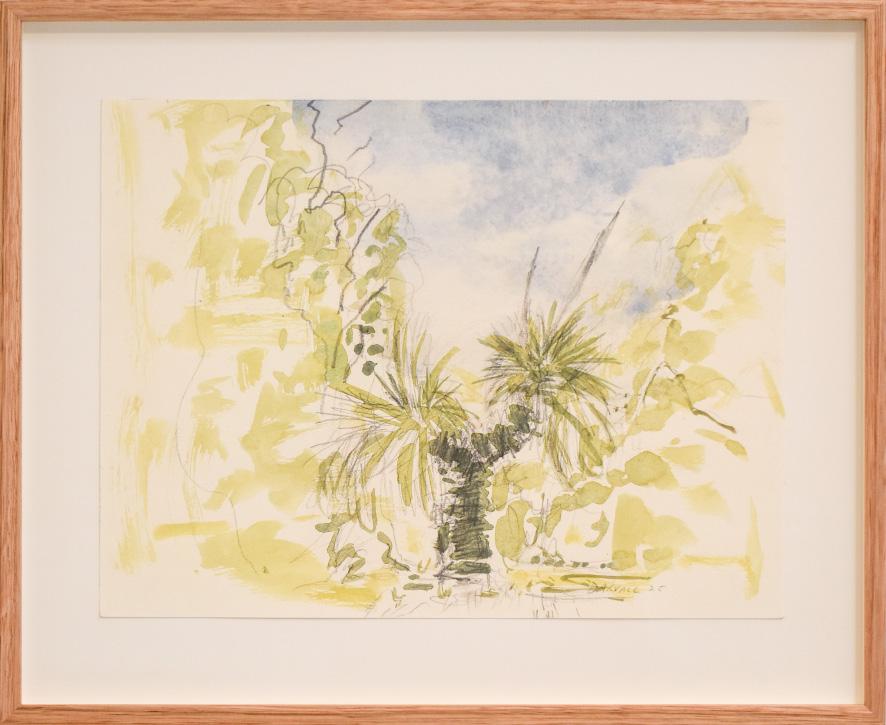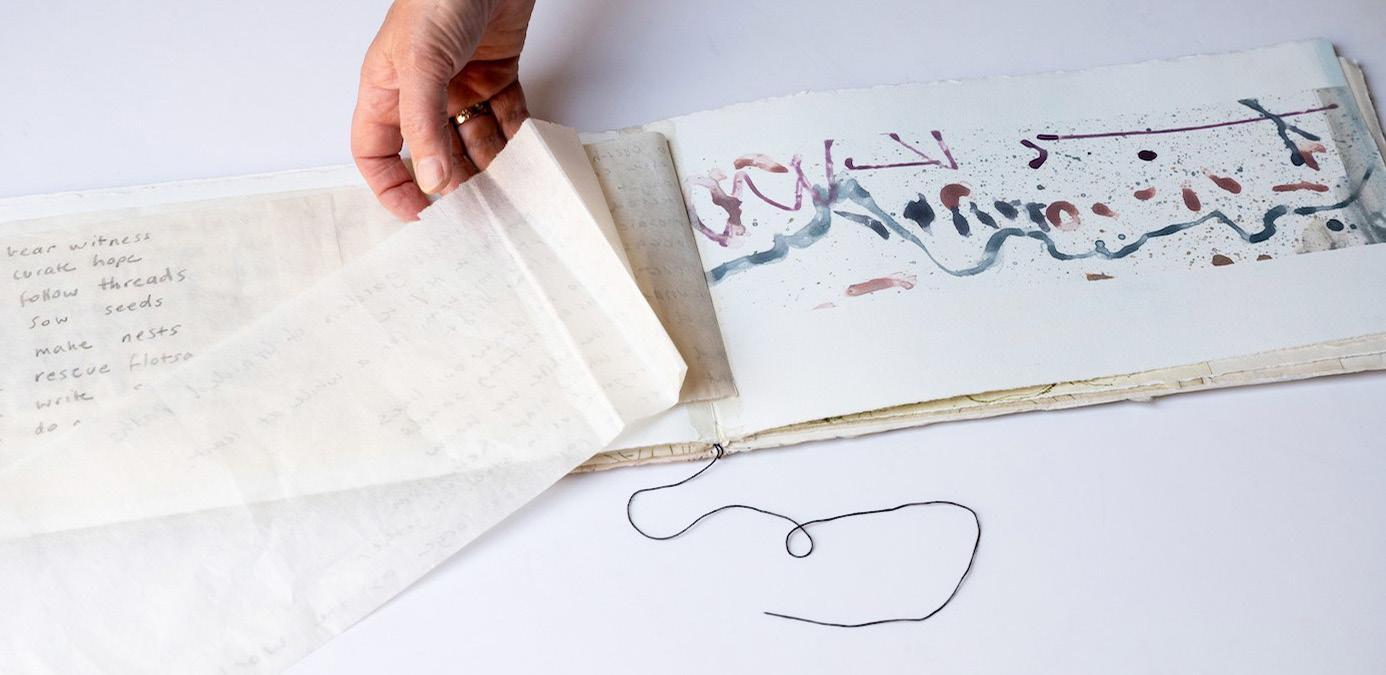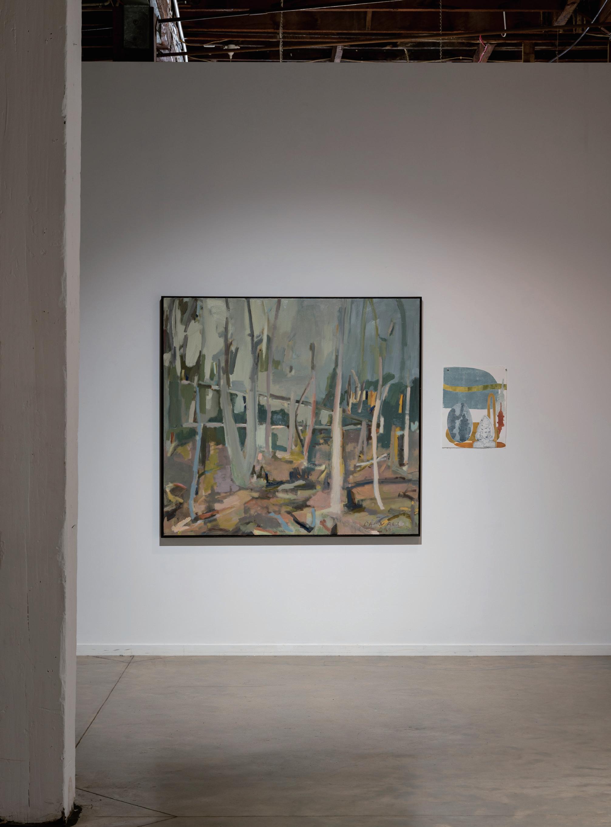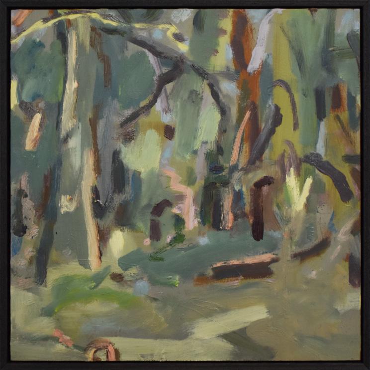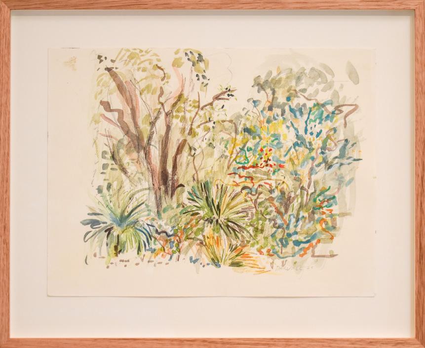 Darvall’s work articulates her sensory encounters with bushland and the ocean, arising from her frequent walks in nearby forests and coastal areas, during which she draws, paints, and listens. Her work enlivens natural spaces, expressing the free interplay between abstraction and figuration. Currently her artistic gaze combats human interference, industrial agriculture, and urbanization. The work ‘Braided Paths’ represents long worn paths which blend into a landscape studded by unruly weeds gnawed to the roots by hungry cockatoos.