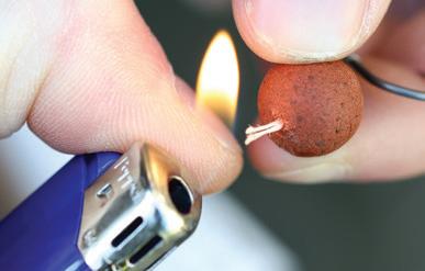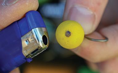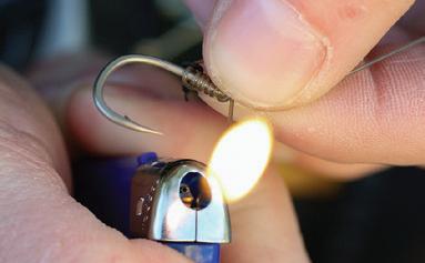 This Shot On The Hook is a versatile rig, as you can present both buoyant and sinking hookbaits, and it can be used with a variety of baits including boilies, particles, naturals, pellets and plastic baits. The mechanics of the rig involves folding a small length of supple braid around the hook just under the barb and then placing a split shot onto the two tags of braid trapping it onto the shank. You then blob the tags with a lighter to secure the shot in position. The size of shot will be dictated by the buoyancy of the hookbait you choose to use and the size of the hook you are using.