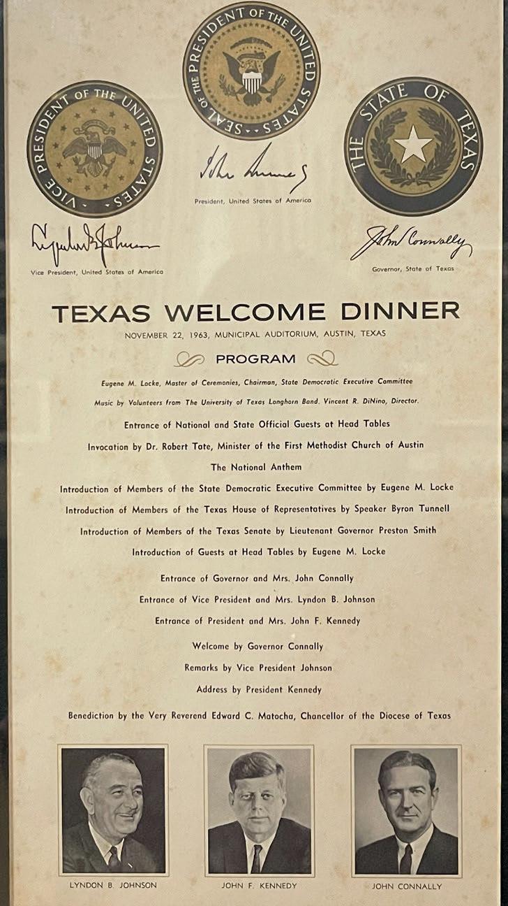 Governor and Mrs. Shivers were close personal friends of Lyndon Johnson and his wife Lady Bird, and there are numerous signed photos, correspondence and mementos from President Johnson and Lady Bird literally everywhere. There are also mementos from the Governor’s war years. I was noticeably struck by a signed photograph of Admiral Nimitz, as well as one from the Japanese surrender at the end on WWII aboard the battleship Missouri, also signed by Admiral Nimitz to his good friend, Allan Shivers. There are so many surprises scattered about, and you find yourself more in awe at every turn. Governor Shivers also corresponded with Dwight Eisenhower, whom he met during the war, and also John F. Kennedy, from Kennedy’s campaign days through his White House years. There is an invitation Governor Shivers received to a “Texas Welcome Dinner’’ on November 22, 1963, at the Municipal Auditorium in Austin, which was to feature appearances by Texas Governor John Connally and his wife Nellie, Vice President Lyndon Johnson and Lady Bird, and President Kennedy and First Lady Jackie Kennedy.