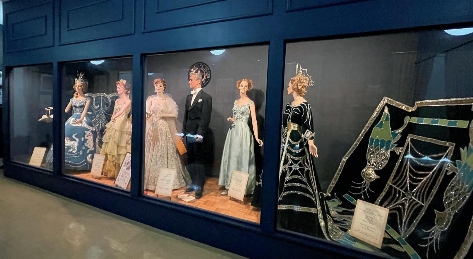 Right: A display of gowns worn by Marialice Shivers and daughter Marialice II. Also shown is the tuxedo Governor Shivers wore to the inaugural ball in 1953.