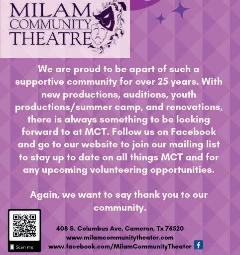 All MCT productions are presented in the Williams Event Center, now operated by MCT. Located at 408 South Columbus in Cameron, the facility continues to be available for rent for private and group functions on dates when it is not needed for theater productions and rehearsals. For more information about rental of the Williams Event Center, call (254) 482-2569. For more information about ticket prices visit MilamCommunityTheater.com. Memberships are also available by contacting producer@milamcommunitytheater.com.