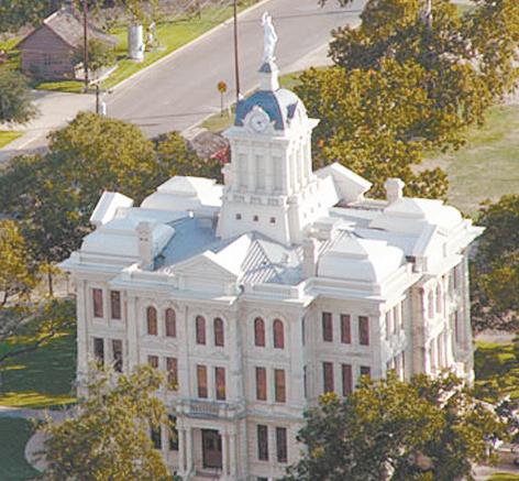Austin architects Jacob Larmour and Arthur O. Watson designed the Renaissance Revival style courthouse, with the cornerstone laid by the local Masonic lodge on July 4, 1891. The first floor included the county courtroom and offices for county officials, while a district courtroom occupied the second and third stories. Identical north and south facades are five-part compositions, while the east and west are three-bay designs. Each of the four fronts has a projecting center pavilion enhanced by a portico and triangular pediment. A mansard roof and central clock tower top an exterior of arched windows, cut stone pilasters and quarry-faced ashlar limestone with fine detailing.