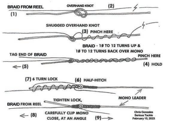 This knot is not only strong and smooth but it’s easy to tie with a little practice. To start, tie a loose, overhand knot in the mono leader as shown at the top of the illustration, leaving about 12” of a tag at (#1). Insert the Braid from your reel through the overhand knot (#2) for 12” or more. Firmly snug, but not tighten, the mono’s overhand knot