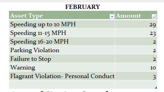 Aside from the dramatic weather patterns for February, Pecan Plantation had a quiet month. Additional Security Patrol Officers have had a greater impact on traffic issues and recent periodic checks of traffic speeds with radar from unmarked vehicles have provided data that many drivers seem more attentive to speed limits on the property.