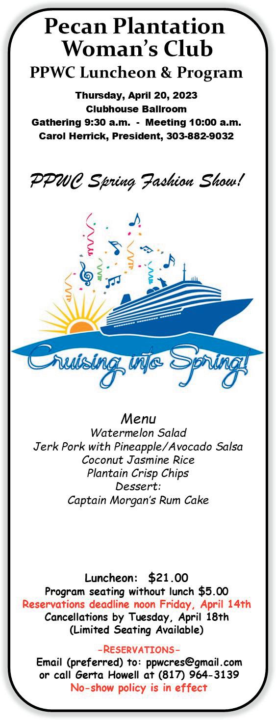 It is hard to believe but spring has sprung. During the month of April, we are going to have a wonderful Caribbeanthemed buffet with bingo. Wear flowered shirts and come and join us on Tuesday, April 11. The buffet will begin at 5:45 p.m. and bingo starts at 7 p.m. The cost is $25 for buffet and bingo, $10 for bingo only. The limit will be 150 with open seating. Get your reservations in as soon as possible!