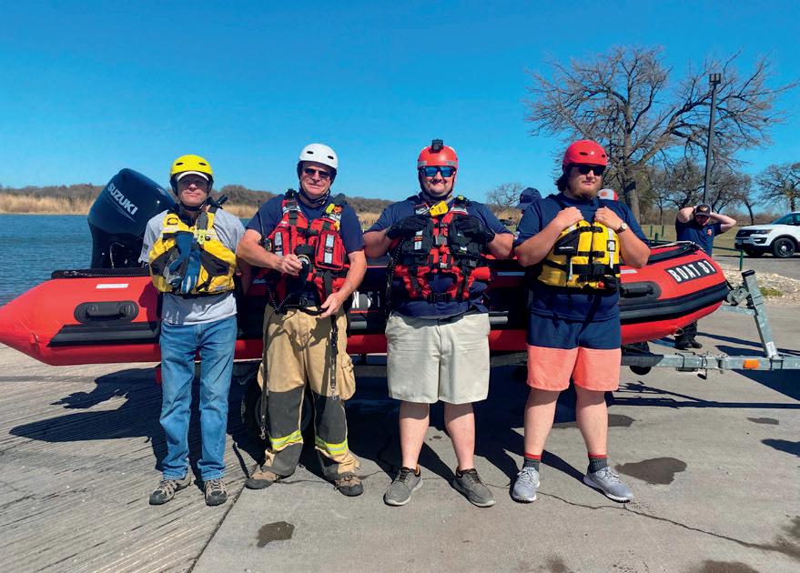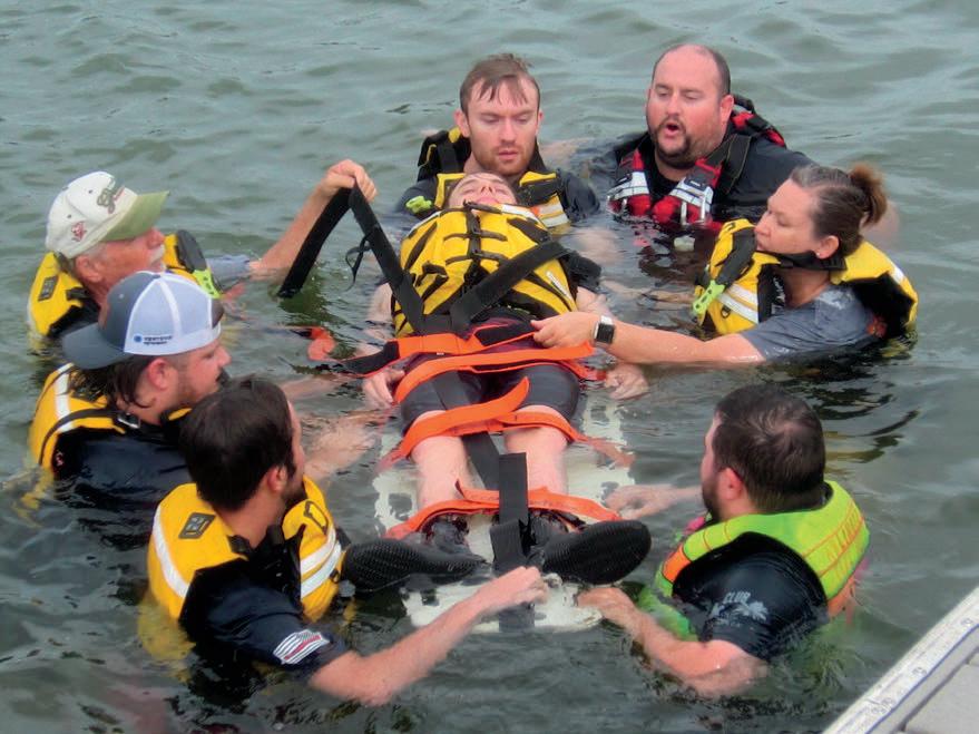 PP VFD perform water rescue while training in Lake Granbury. Joining in, from left, are firefighters Perry, Tharp, Caughley, Lewis, Captain Christy, and firefighters Skoog, Morgan.