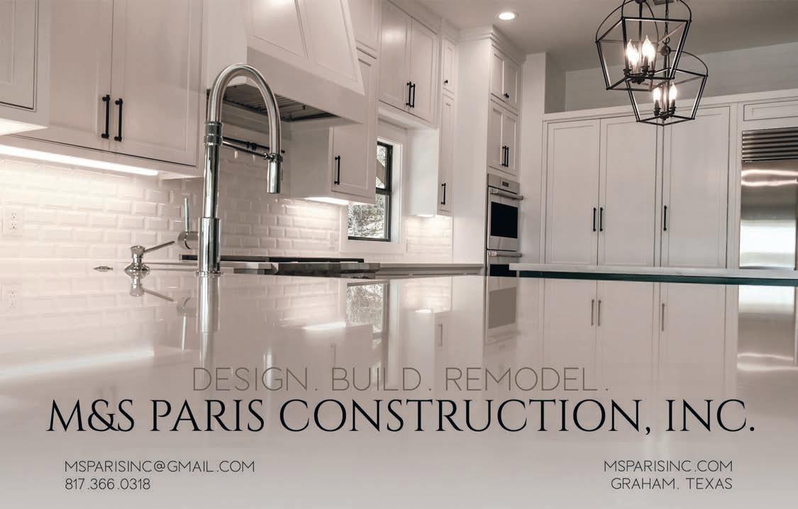 88 – 2023-2024 Graham Community Guide Accepting Most Insurance 24568 Jordan 1332 Hwy. 16 S • Graham, TX 76450 940-549-1011 9am-6pm Mon.-Fri. • 9am-Noon Sat. Pharmacy 24571 Home ★ Life ★ Auto Commercial ★ Specialty Pam Duncan Agent/Owner Morgan Mathis Agent 437 Oak Street • Graham, TX 76450 • 940-549-2504 I N S U R A N C E A Proud Past with a Solid Future Since 1896 INVENTORY AVAILABLE – Selling Fun Since 1978 –y 506 Southview • Graham, TX 76450 • 940-549-6182 • dandjpolaris.com 9:30 am - 5 pm Tuesday - Friday • 9:30 am - 3 pm Saturday 24606 Polaris D&J’S ATVs | Rangers Timetomakeityourown withWeekendPackages,On-SiteLodging, IncludedVintageDecor,Coordination,andmore... www.SparrowCreekRanch.com 24615 RICHARD SCHREIBER Agent - McLemore Realty Group 111 S. Center St. / Archer City, TX 76351 Cell: 940.733.0316 Of ce: 940.574.4888 rschreiber@mossyoakproperties.com · www.moreoftexas.com 24569 JAY FRAMPTON Professional Home Inspector TREC# 10408 940-521-4668 PO Box 481 Graham TX 76450 jay@insightinspectionstx.com insightinspectionstx.com 24576 JEANETTE HEDAYATI, BC-HIS BOARD CERTIFIED IN HEARING INSTRUMENT SCIENCES Open Monday–Friday By Appointment 1714 Hwy. 16 S • Graham, TX 76450 • 940-549-5452 (Across from Best Western) Graham Hearing Aid Center HEAR HERE! 24611 PROFESSIONAL, CARING SERVICE FOR 41+ YEARS Lake Godstone at Marluc Bella Vita Ranch For reservations or more information: 940.275.0908 • www.LakeGodstone.com Tentsites, Group Campgrounds, Cabins, 35-Person Lodge and More. Rent one or book it all! Family Reunions Fishing Hiking Biking Kayaks Church Groups Canoes Pedal Boats Sports Field 24625