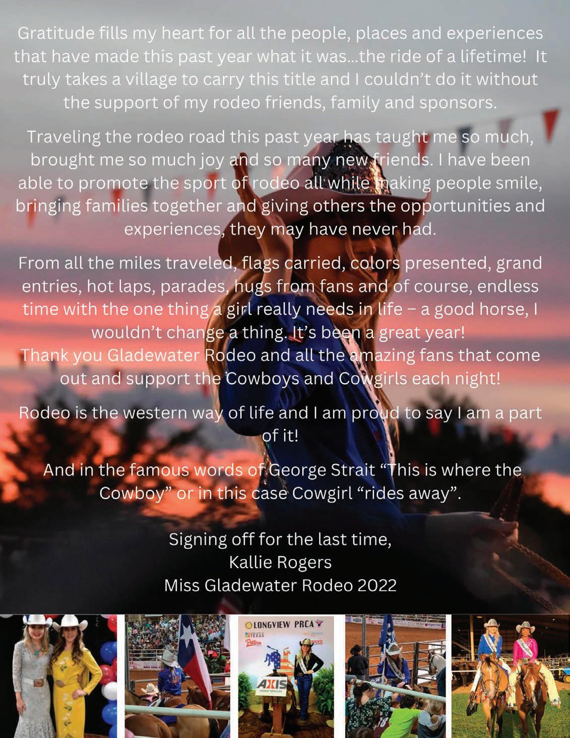 Before I go on, I, along with the rest of the association, would like to thank all of the hands that go into putting on a rodeo. To our sponsors, donors, volunteers, community members, co ntracted personnel, contestants, and last but certainly not least, our fans – thank you. The Gladewater Round -Up would not be possible without y’all!