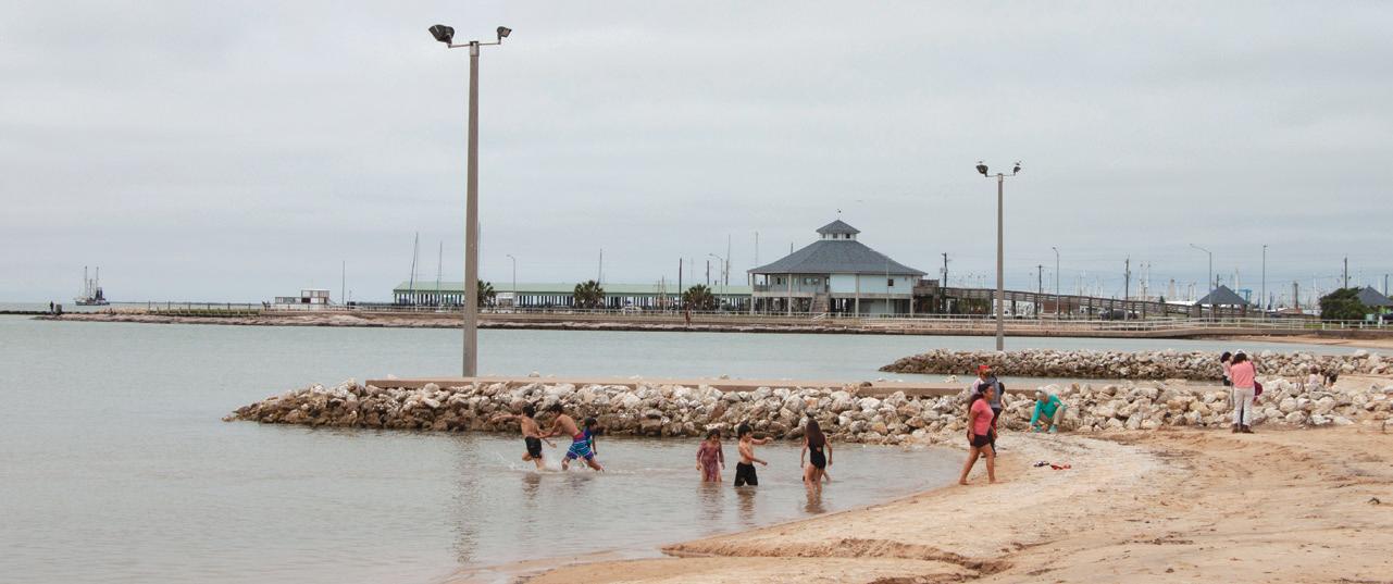 Palacios’ historic pavilion and T-head pier jut into the bay near the park and seawall.