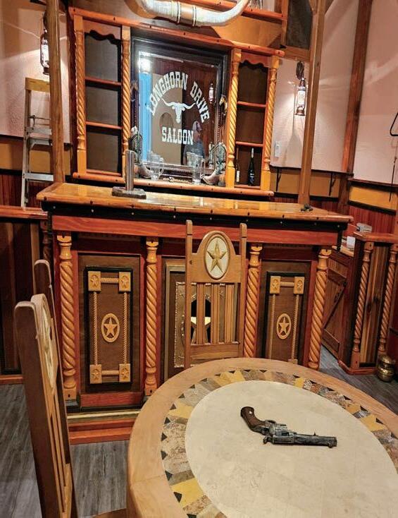 Having seen both during the tour he gave us for this story, I’m not sure which likely won them over more—the o cer’s conference room with the corner trophy case and a fantastic KC-logo table top that George built or the Old West Saloon he crafted just across the hall.