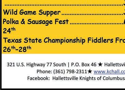 the Hallettsville KC Hall, an organization which celebrated its centennial in 2023 and annually hosts the Texas State omino Tournament in anuary, the State Championship 42 Tournament, the Polka Sausage Festival, and Fiddlers Frolics, where the official Texas State Fiddle Champion is crowned each April. There’s also the semiannual Sacred Heart Catholic Church picnics held the Sundays before Memorial ay and Labor ay, respectively, the uarterly Hallettsville Market ays, and much more.