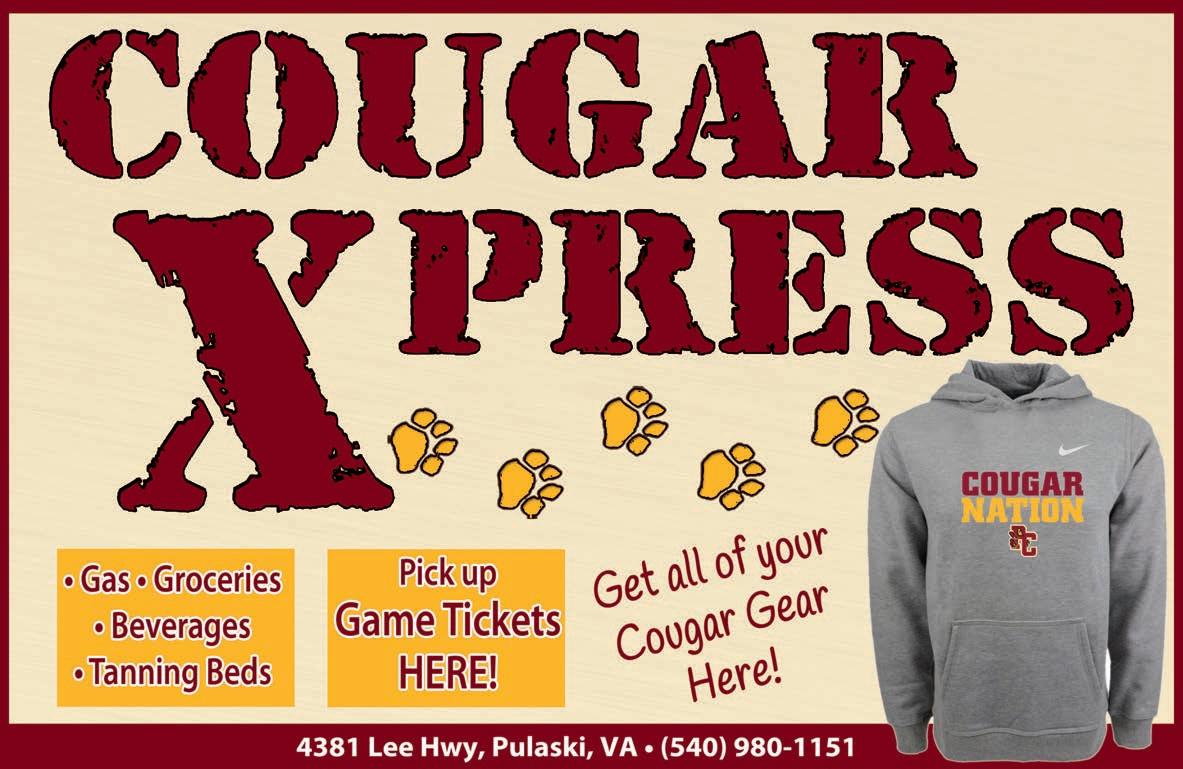 C B D A (540) 674-5100 www.acehardware.com M S S Good Luck COUGARS! N L K C A e t • m Good Luck Cougars! Main Street | Pulaski downtownpulaski.com