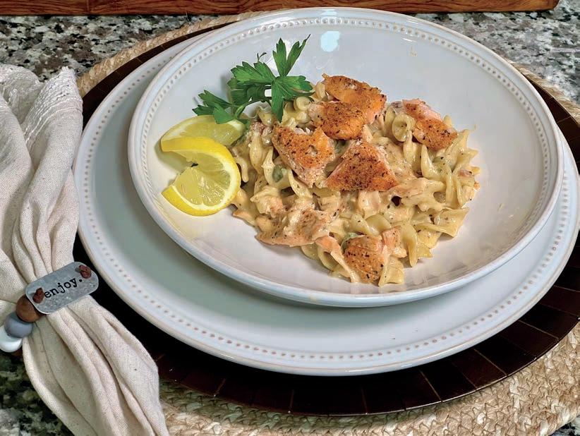 Prepare egg noodles according to package, drain water, add to sauce, and reduce heat to the lowest setting. Cover and stir often for 5 minutes. Finally, remove from heat and gently stir in salmon. Garnish with Italian parsley, lemon slice, garlic bread, and ENJOY!