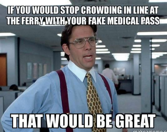 The fa e medical pass situation makes it difficult for the folks that really do have medical priority and unfair for the "rule followers" that are waiting to board. There has to be a better way to verify a valid medical pass quickly, and fairly, during what is already a frenzied process of boarding the ferry.