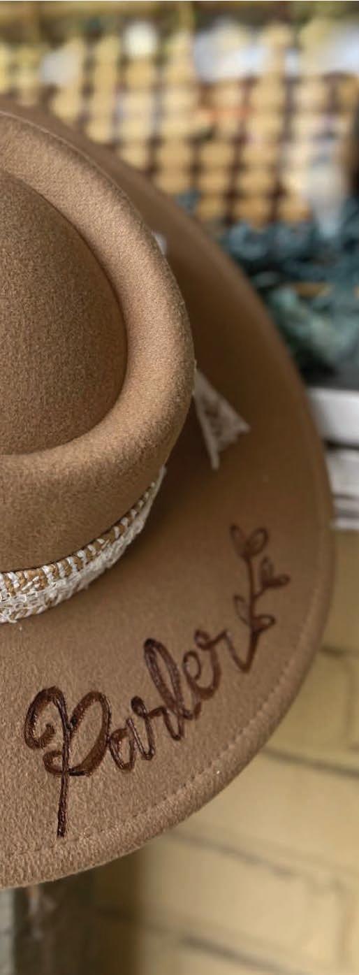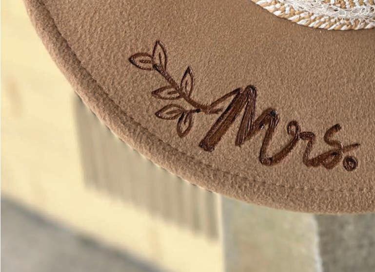 G: I have my own tools, and I free hand all of the branding that I do on each hat. I do have stencil letters that I can warm up and brand on the specific hat, but most of my work is freehand. I did a bride-to-be’s future last name, so she could wear it when she’s leaving the ceremony. I freehanded that whole thing. I’ve done people’s initials, I’ve done verses. I’m getting ready to do a Coastal Carolina Hall of Fame lettering on one currently. I do a lot of different brandings.