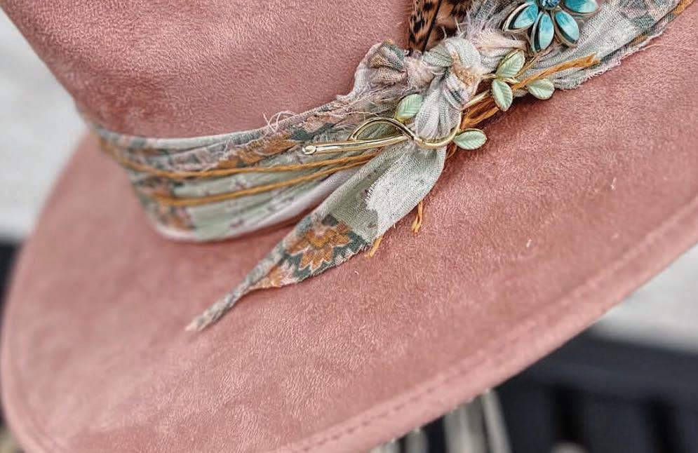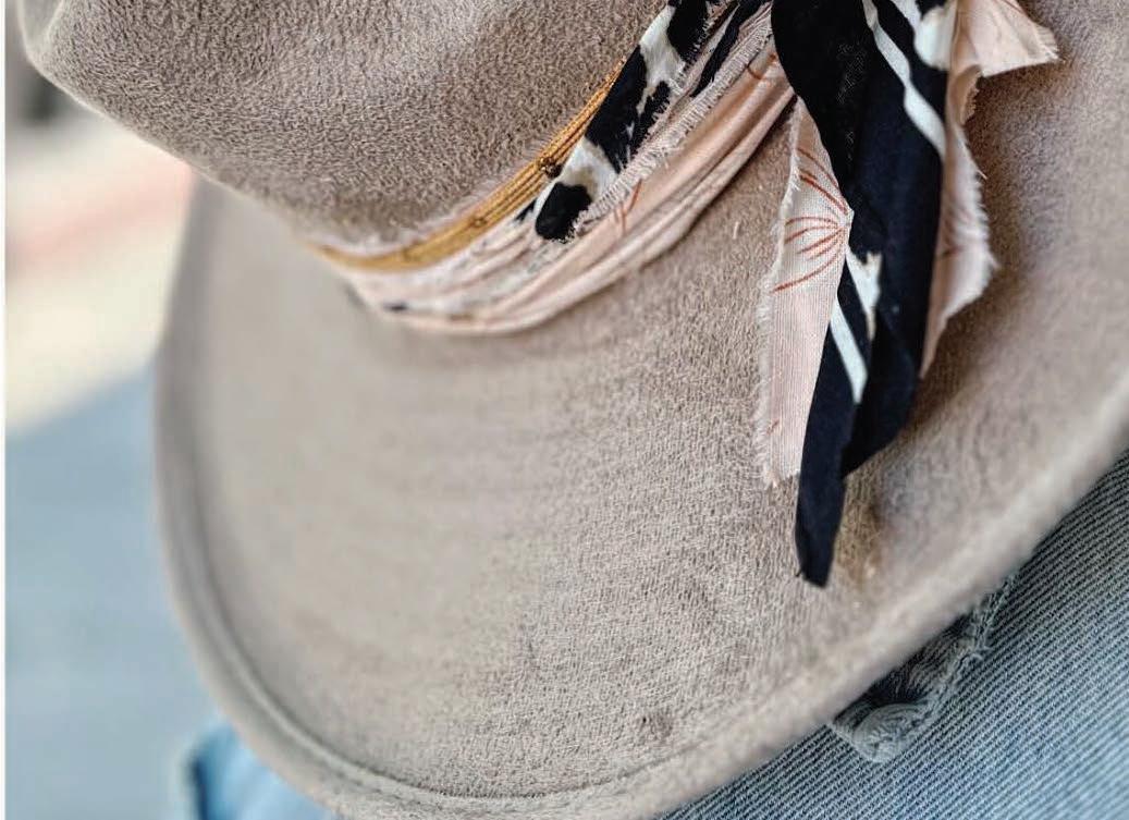 there are people that just come and purchase one that I’ve done, but mainly, I try and do it specific to the individual. I’ve had people come in and say ‘Hey, this is my grandma’s veil, this is my granddaddy’s napkin, this is my daddy’s bow tie,’ So, I try and create it uniquely to the individual so it tells a story. So each hat, if I haven’t done it, or if I’ve done it for someone else, I allow them to name the hat so it’s also unique to them. I’ve done some just for people in general that liked a bunch of different stuff added to them. I use leather, lace, cotton, all kinds of different stuff. And then, I’ve had people more here lately that have understood where they want to take the hat and have it made more distinctive to them. The last hat that I did, the scarf was the lady’s mom’s, the napkin was her dad’s, and both of them had passed a couple years ago so it was definitely a unique. And, it was something that they could wear all the time, but it wasn’t necessarily over the top. That’s been the pleasure of making them is they’re specific to each individual. And as I said before, I allow them to name them, so that helps make the hats even more unique to each person.