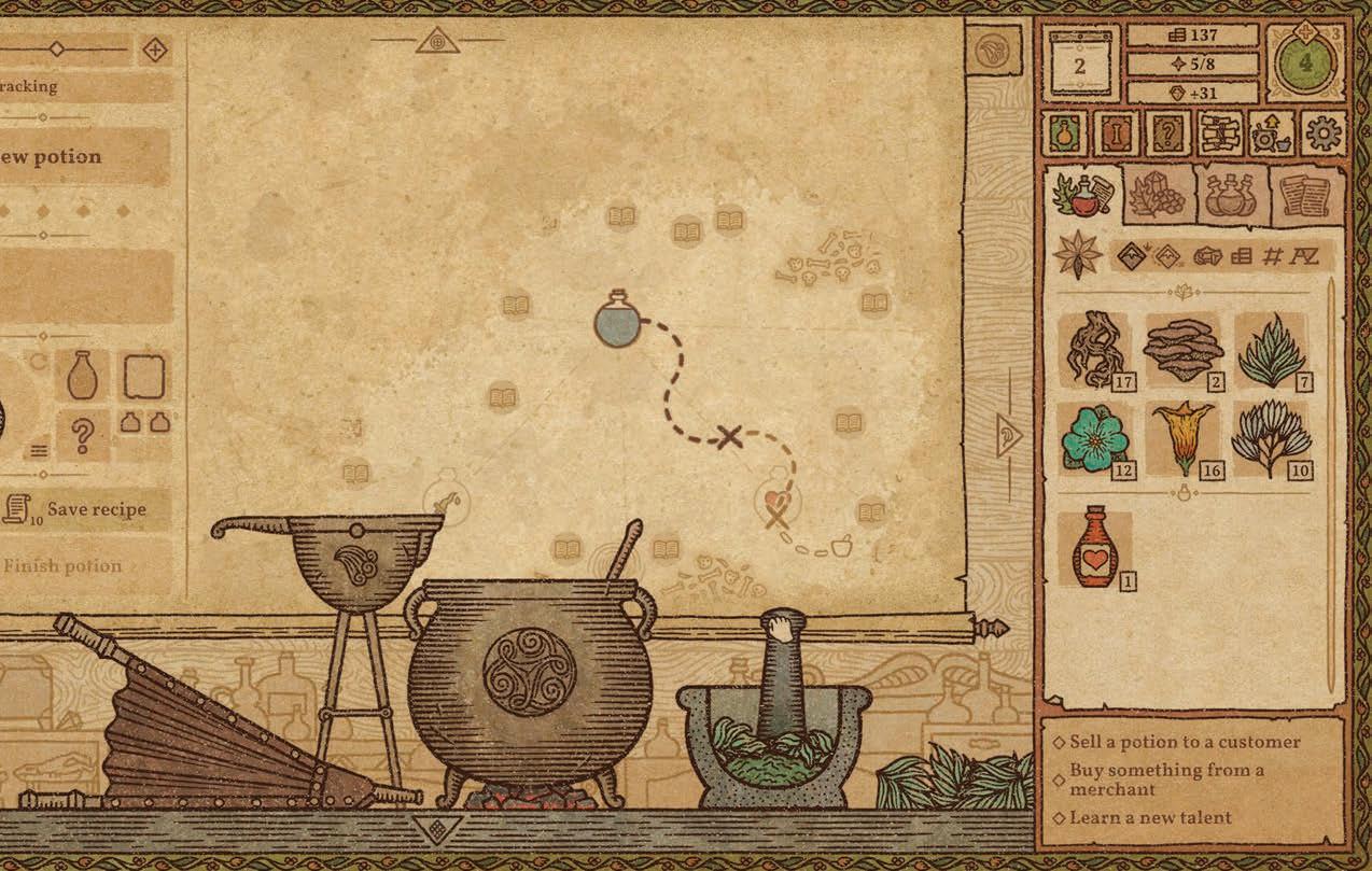 You start out as a novice alchemist looking for a place to set up shop. After coming across an abandoned wi ard s house, you make yourself at home. Potion Craft has a simple layout, reminiscent of a menu screen. The colors are a mix of browns and rust colors adding to the co y cottage-core vibe. ou start out with a beautifully drawn cauldron with a Celtic-style symbol on the side. ery uickly, you will unlock the bellows and mortar and pestle items that will aid you in your potion-making. The background is lled with shelves, vials, books, and a chest. The giant map will esh itself out as you progress through the storyline, making more intricate potions as you hone your skills. n the right of the screen, you will see your game s inventory, which doubles as the game s menu screen. The illustrated items are so uaint and easy to use, as you simply drag and drop the ingredients where they are needed. There s no uestion as to why Potion Craft is beloved by co y gamers. etween the fantastic art, the beautiful Renaissance music, and the ambient sounds, you have a recipe for success. Potion Craft Alchemist Simulator can be found on PC, and the developers are currently working to have the game available across all gaming consoles along with upcoming game features.