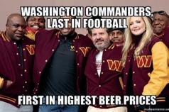 The highest price is $14 per beer. The loathsome Wash ington Redskins/Football Team/Commanders have the highest beer price at $14. A team that hasn’t finished above .500 in years. Four teams are tied with the second highest beer price at $11.50. A single beer will cost you $11.50 at Tampa Bay, New Orleans, San Francisco, and Jacksonville.
