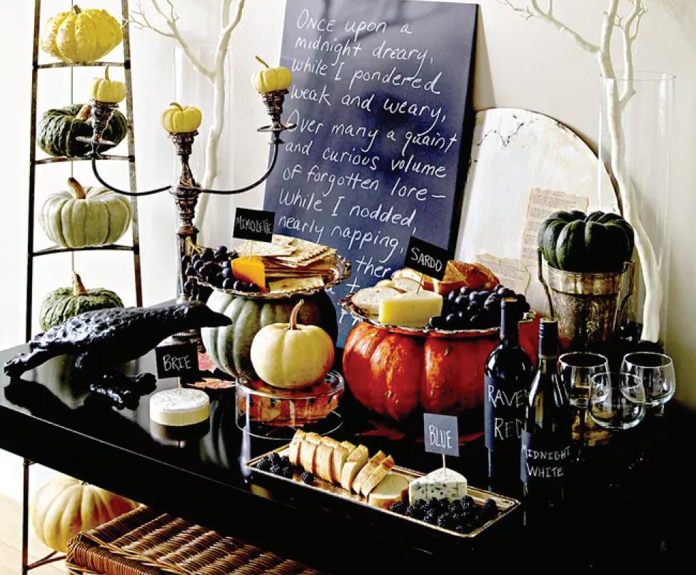 For those that are crafty, consider the endless possibilities you can achieve with paint and pumpkins. I suggest trying a stencil, a paint pen, or even stickers to customize your décor. Try small pumpkins with names of dinner guests in place of name cards on your table. Or, try family names in various sizes in an entry hall. The possibilities are endless. White pumpkins are a special addition and can be dressed up with bright ribbons and candle holders or other natural elements like vines, moss, and more atop large platters for mobility. If you have children, they’ll be delighted with pumpkins covered in spiders! And this couldn’t be easier in terms of crafting.